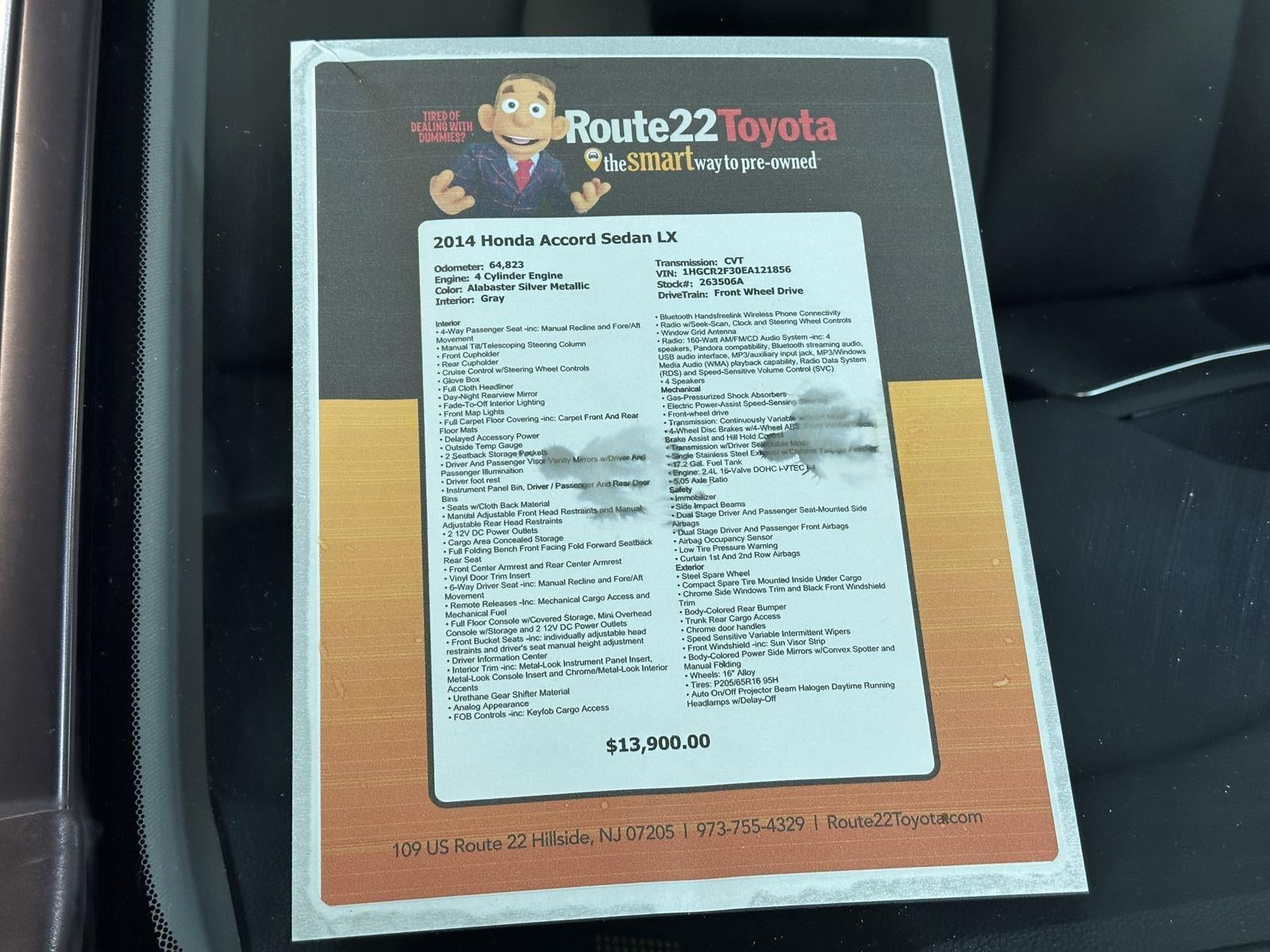 This beautiful 2014 Honda Accord Sedan LX located at Route 22 Toyota has been thoroughly inspected by our service technicians, and fully reconditioned for immediate delivery.