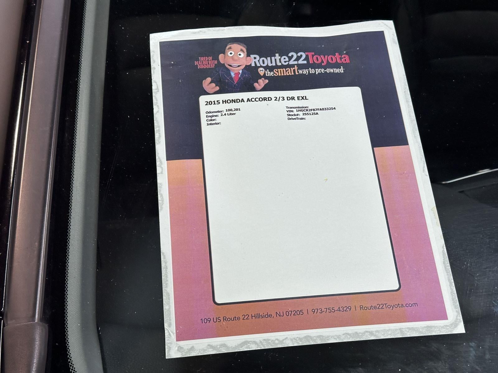 This beautiful 2015 Honda Accord Sedan EX-L located at Route 22 Toyota has been thoroughly inspected by our service technicians, and fully reconditioned for immediate delivery.