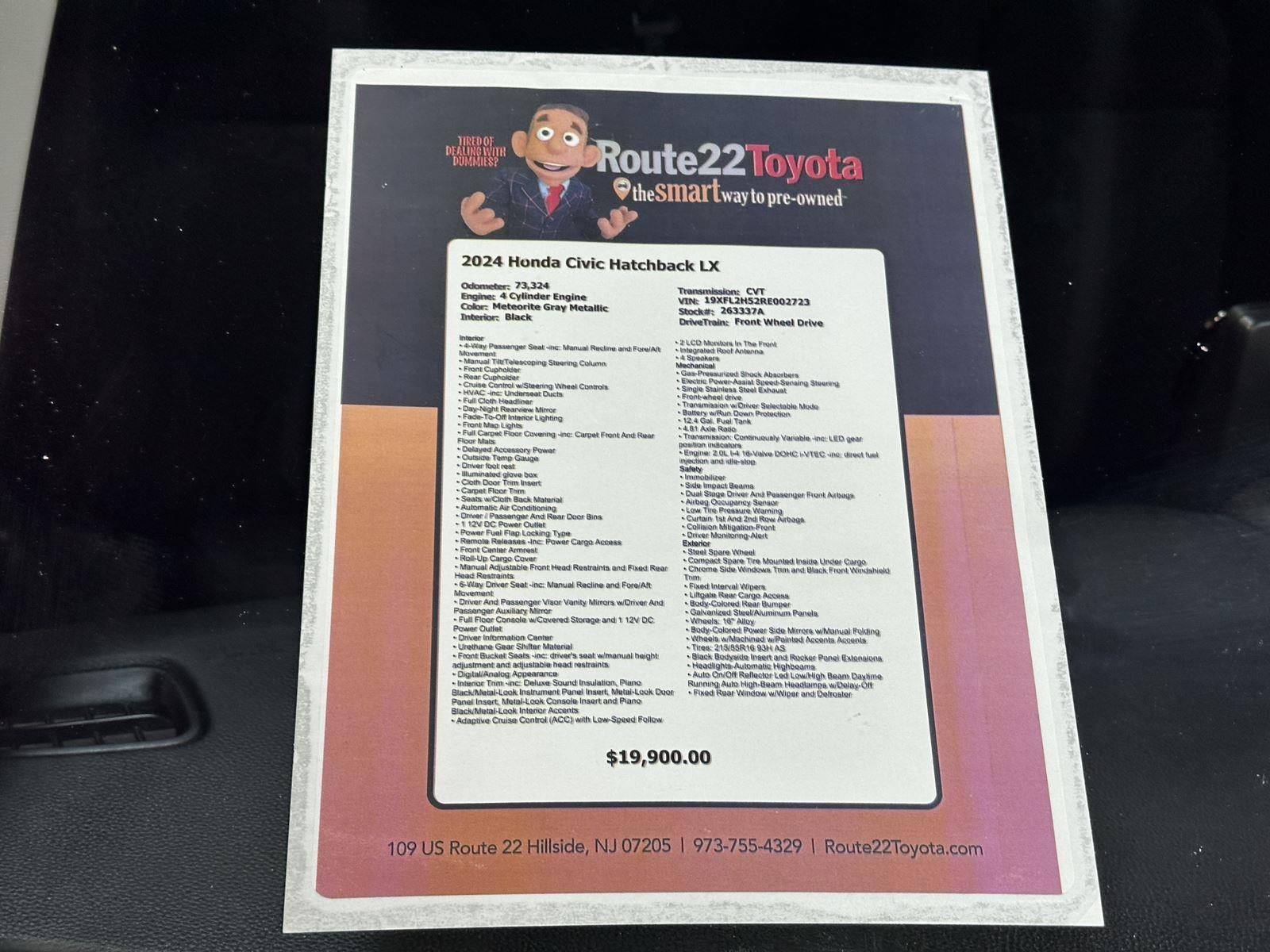 This beautiful Meteorite Gray Metallic 2024 Honda Civic Hatchback LX located at Route 22 Toyota has been thoroughly inspected by our service technicians, and fully reconditioned for immediate delivery.