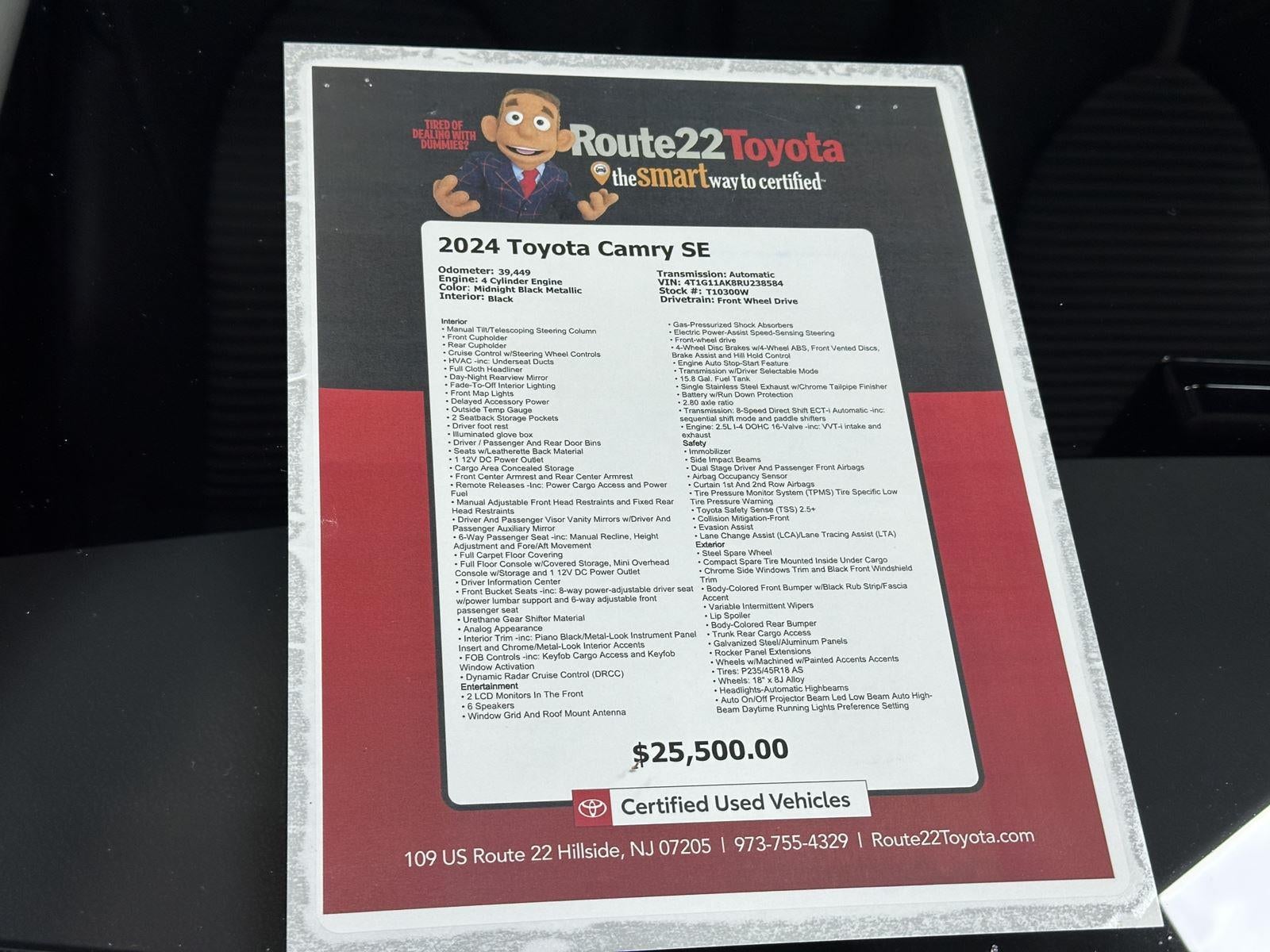 Our Midnight Black Metallic 2024 Toyota Camry SE has 39,449 miles with Black interior color. Stock Number WU29879