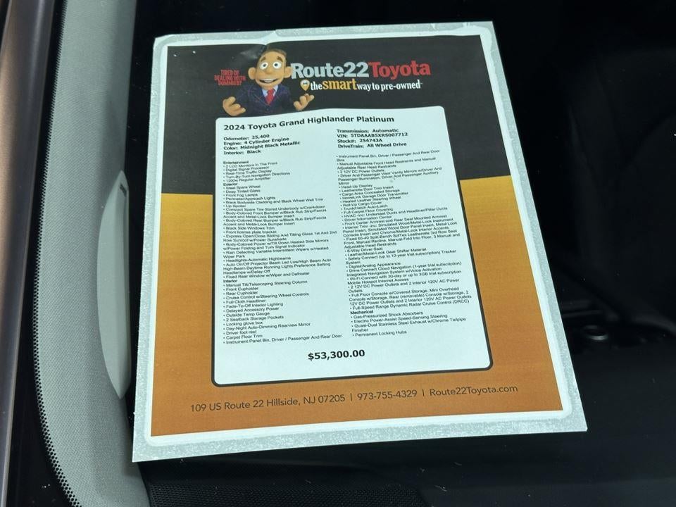This beautiful Midnight Black Metallic 2024 Toyota Grand Highlander Platinum located at Route 22 Toyota has been thoroughly inspected by our service technicians, and fully reconditioned for immediate delivery.